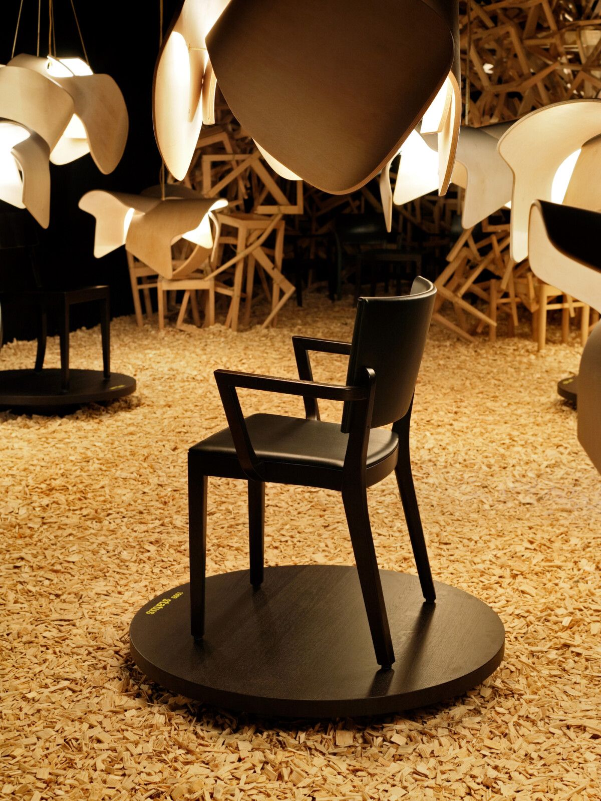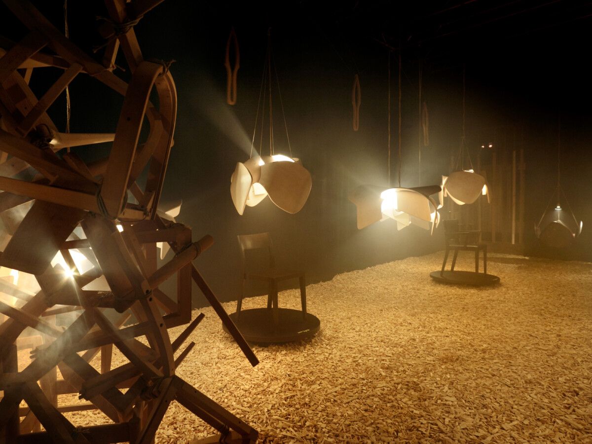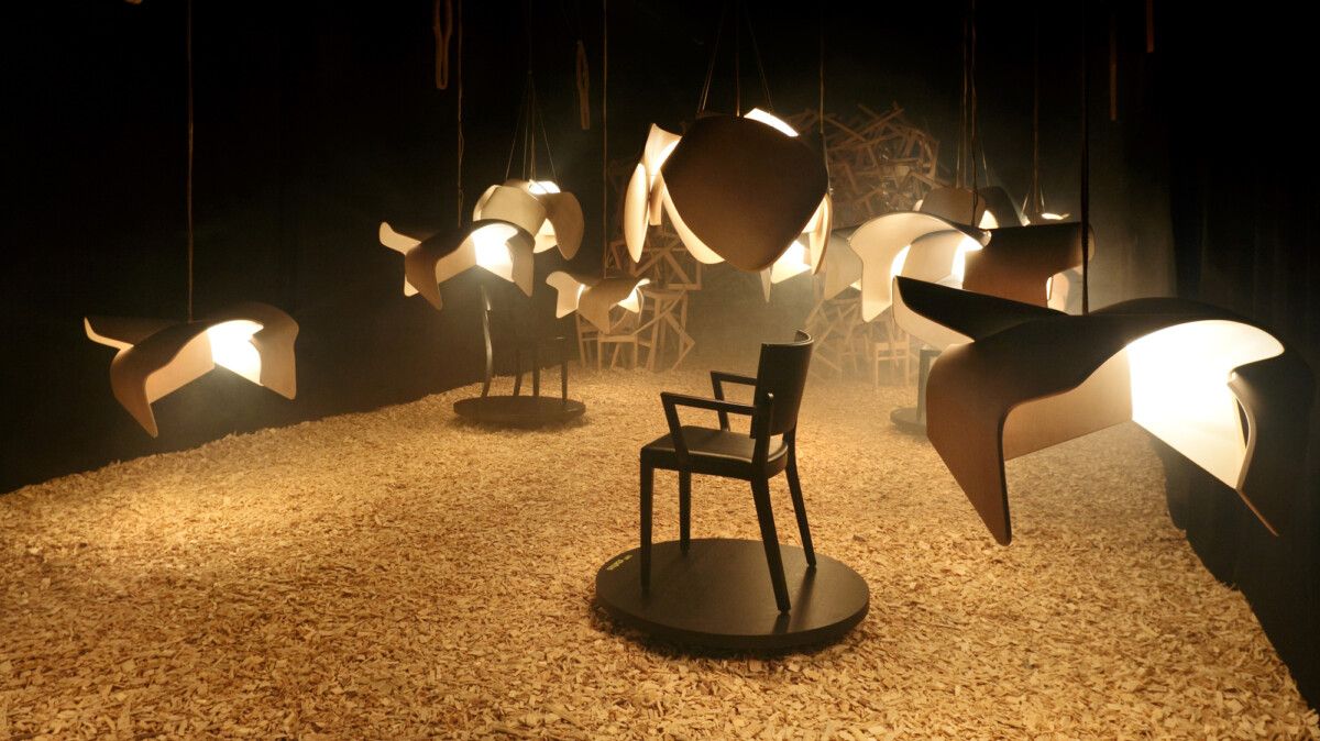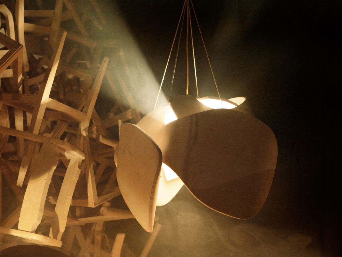 It is as if one were walking through an autumnal forest at dusk. Wooden slats used in the production of chair legs hang like delicate trees from the ceiling, forming a narrow path leading the visitor to a half-lit space with a scent of dry wood. There, over a floor covered in autumn leaves, 15 hanging wooden sculptures made from the shells of chairs glow. 10 installations from arm-rest and base elements create a poetic soundscape as they strike.