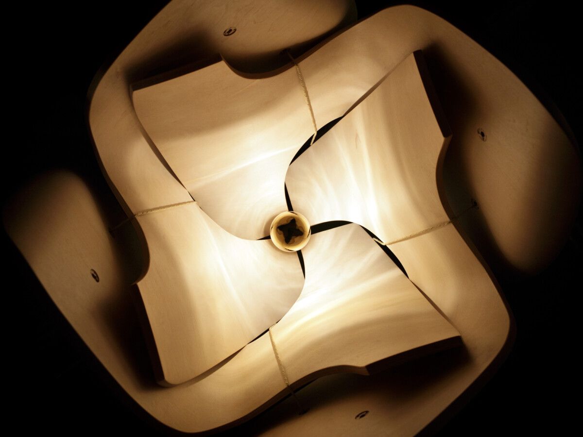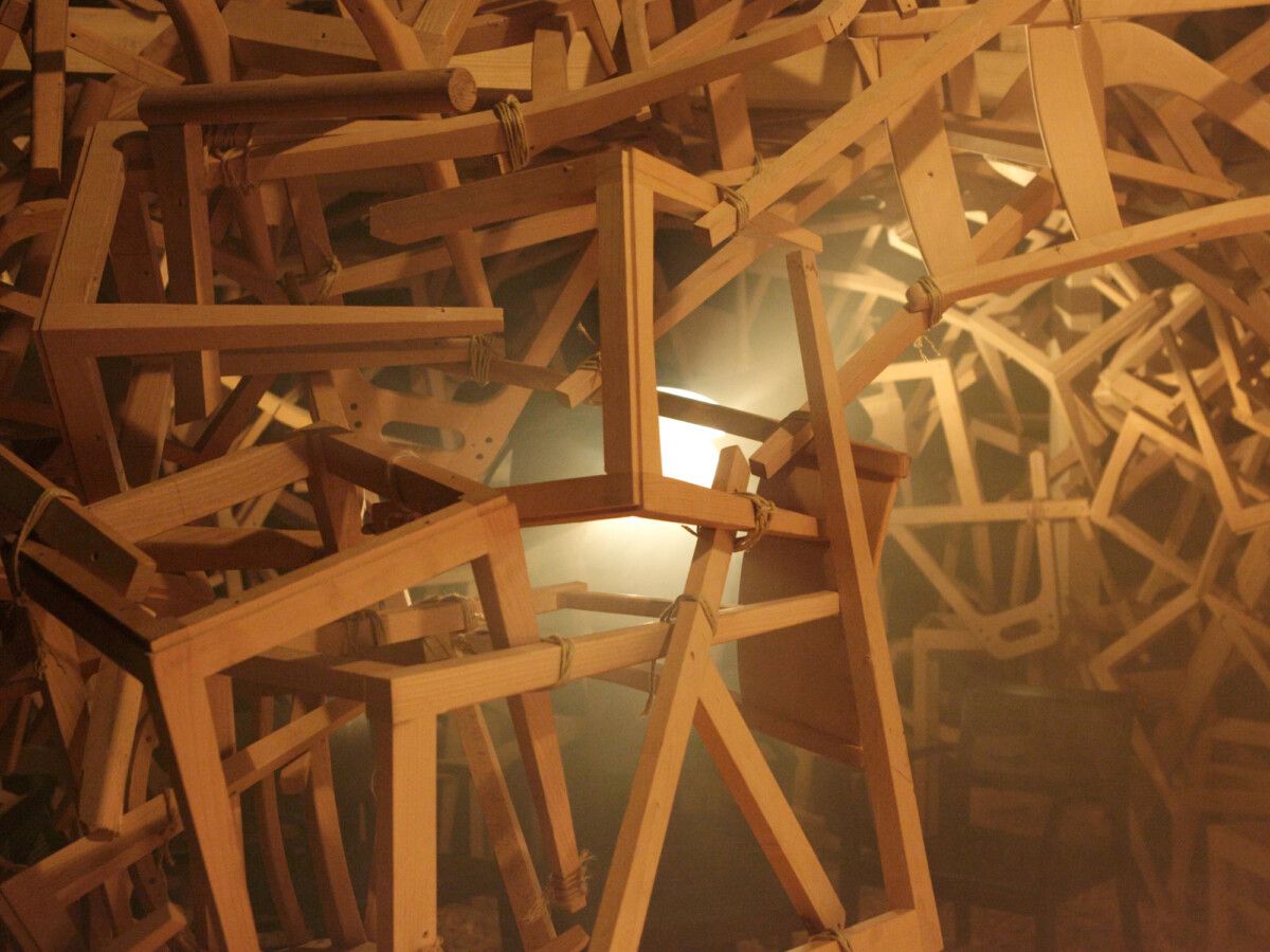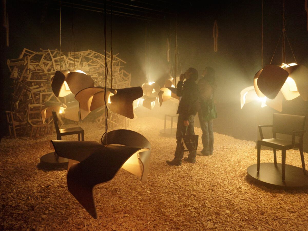 It is as if one were walking through an autumnal forest at dusk. Wooden slats used in the production of chair legs hang like delicate trees from the ceiling, forming a narrow path leading the visitor to a half-lit space with a scent of dry wood. There, over a floor covered in autumn leaves, 15 hanging wooden sculptures made from the shells of chairs glow. 10 installations from arm-rest and base elements create a poetic soundscape as they strike.