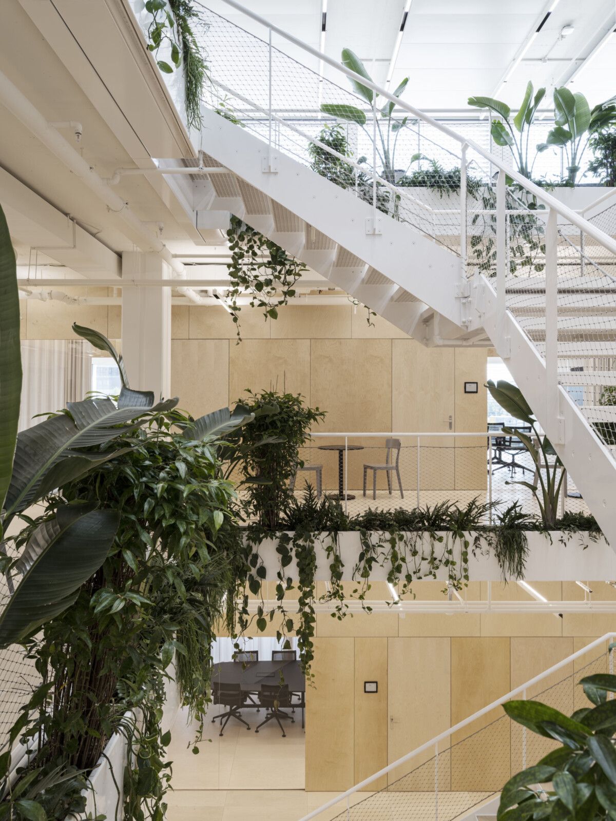 The spatial atmosphere is characterised by a wooden floor specifically developed by Hürlemann. The birch plywood panels can easily be replaced when worn and are 100% recyclable. The plants that hang from the ceiling and contribute to a better indoor climate are also in keeping with Implenia's commitment to sustainability. The staircase atrium at the centre of the headquarters is particularly symbolic. Framed by wild-growing plants, it connects and links the individual departments and employees with each other, embodying the name of the new headquarters "Implenia Connect".