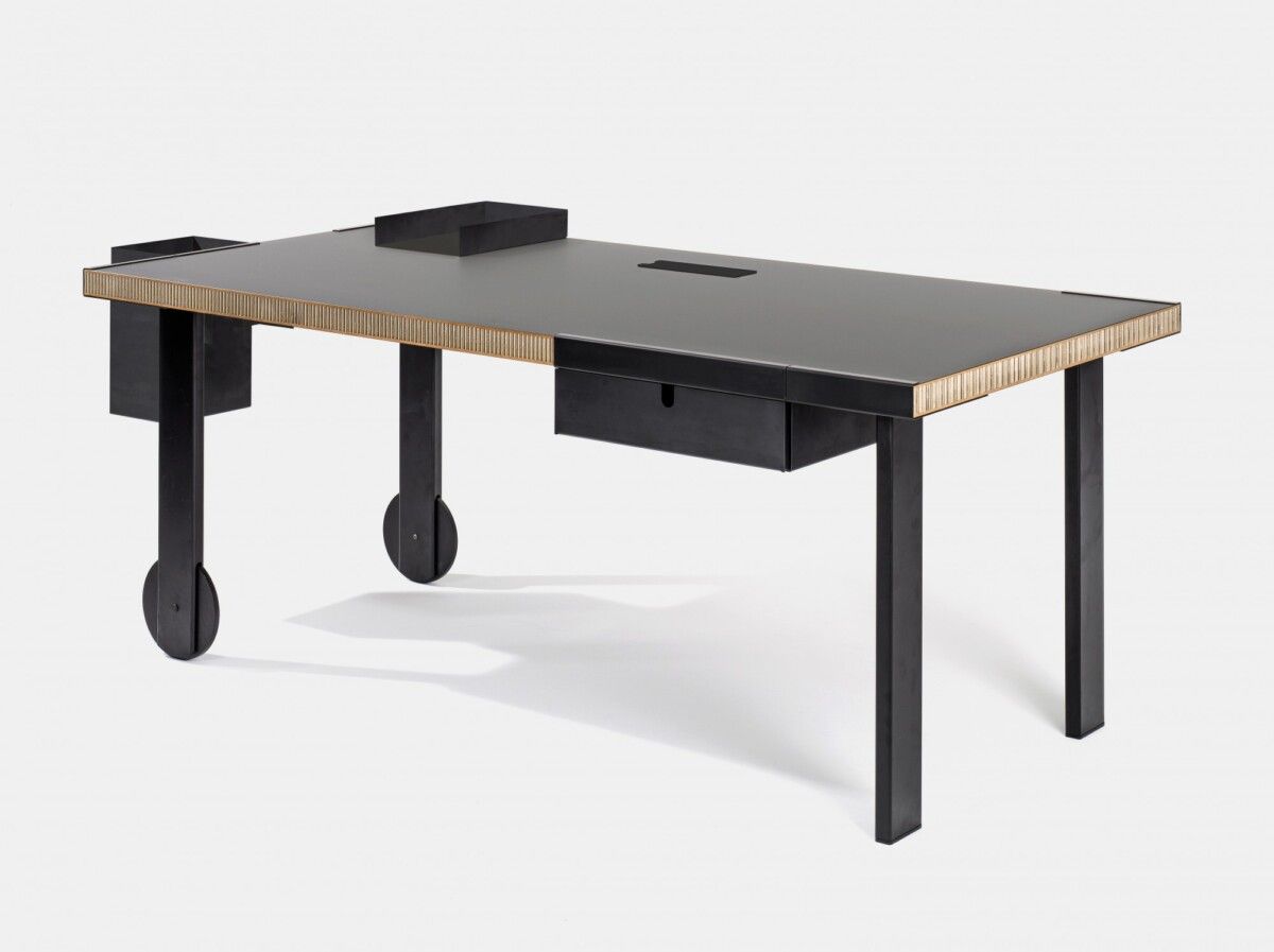 Paula’s Atelier is a table and a shelving system in and on which tools can be individually placed. The design celebrates the nature and identity of honeycomb board rather than concealing it. At the edges the nature of this lightweight board covered with synthetic resin is openly displayed. This honest use gives the board a self-assured beauty. At the same time the design addresses and uses the particular advantages of this material, such as its lightness and stability. Pre-bored holes allow the tools to be positioned as needed. Thanks to the innovative technology of woodwelding® the drawers, pigeonholes, shelf supports etc. can be directly connected to the board that forms the desk-top directly. The floor remains uncluttered as the wastepaper basket hangs from the board and the cable runs along the underside of the desk-top with the help of a cable tray and cable “mushrooms”.