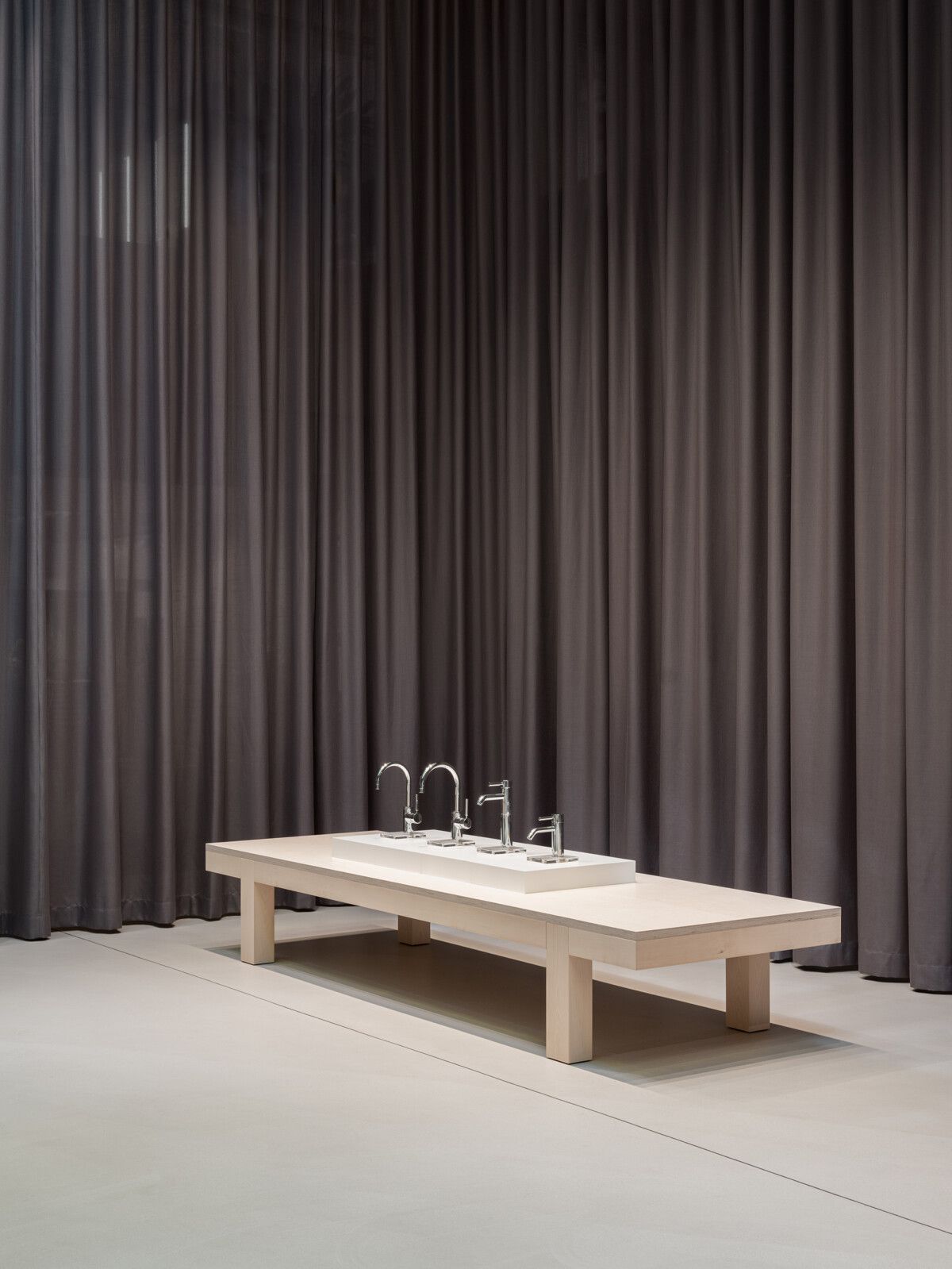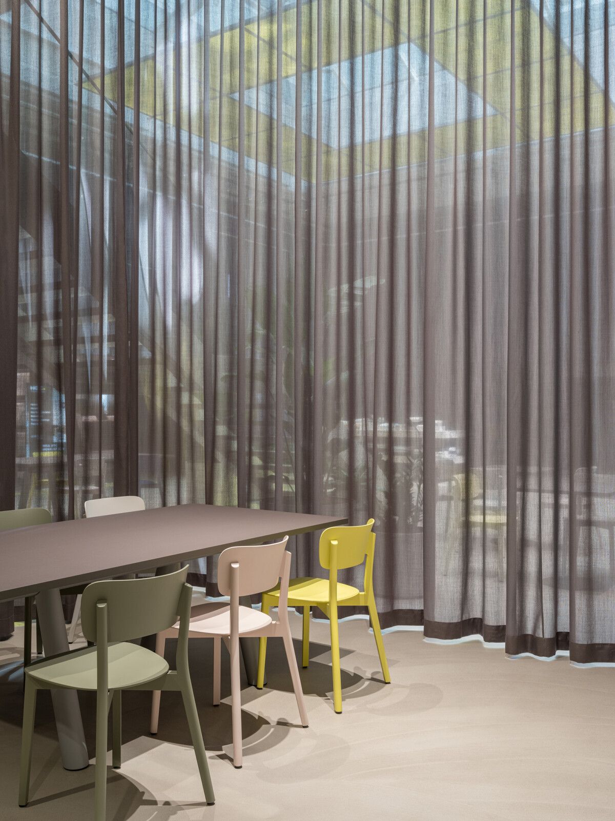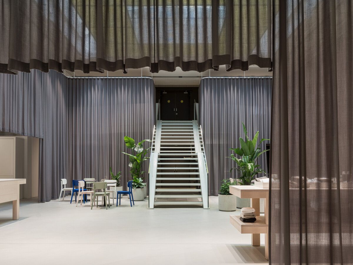 The central element of the intervention is a room-high, semi-transparent curtain that zones the space, guides movement and directs the view towards what is essential. Sometimes permeable, sometimes shielding, this textile gesture creates orientation and calm.
