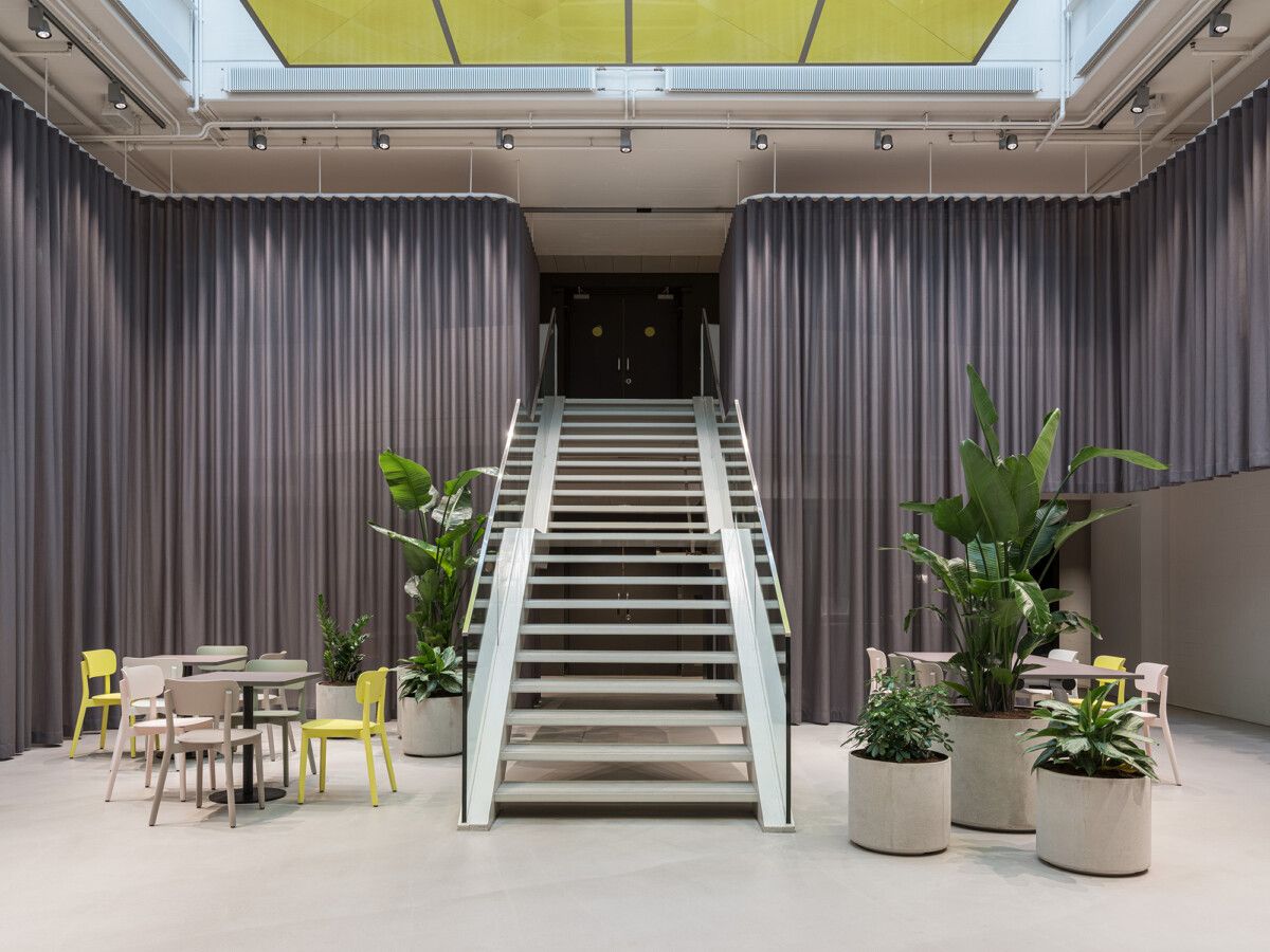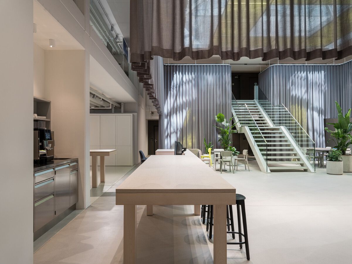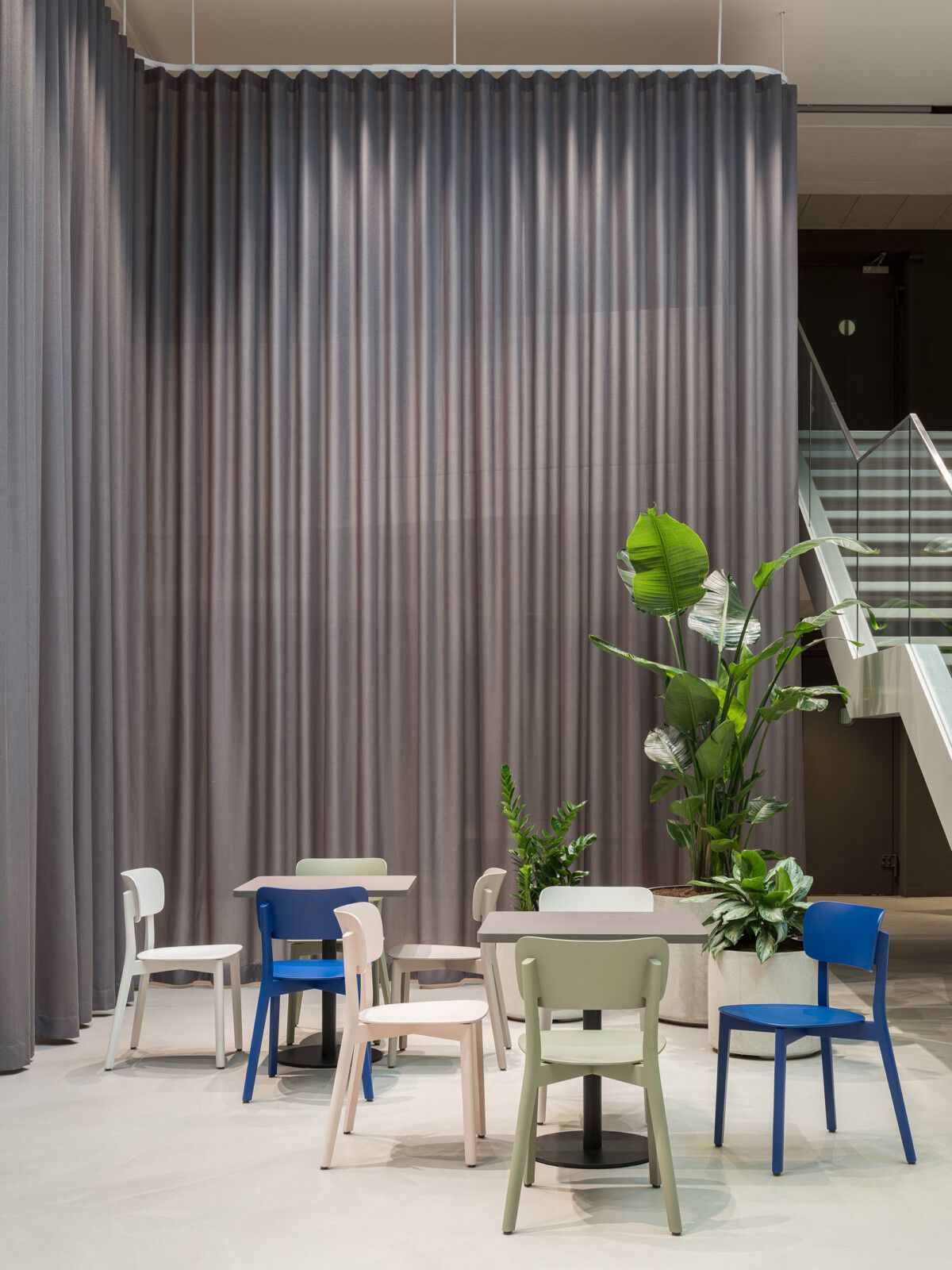 The central element of the intervention is a room-high, semi-transparent curtain that zones the space, guides movement and directs the view towards what is essential. Sometimes permeable, sometimes shielding, this textile gesture creates orientation and calm.