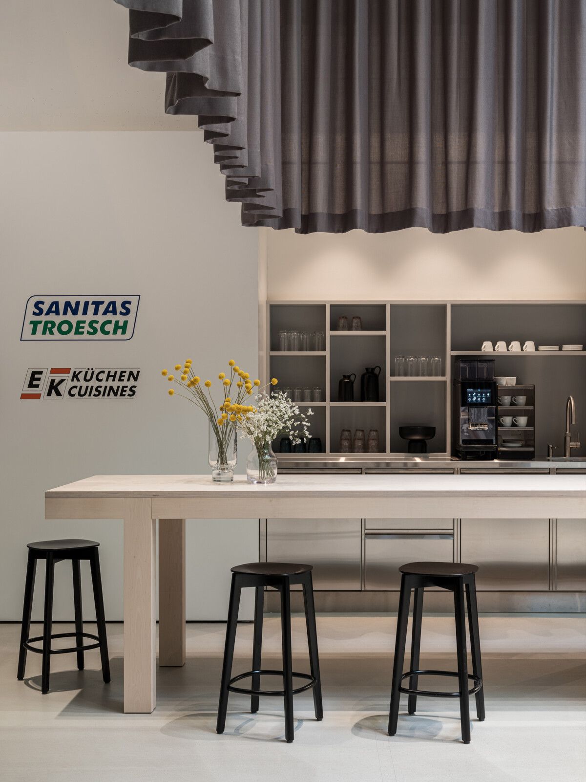 The furniture designed by dopo Innenarchitektur follows the materiality and design language of the exhibition concept, giving the space an open and welcoming atmosphere. The setting is complemented by stackable shop gondolas and flexible meeting zones that allow for a variety of uses.