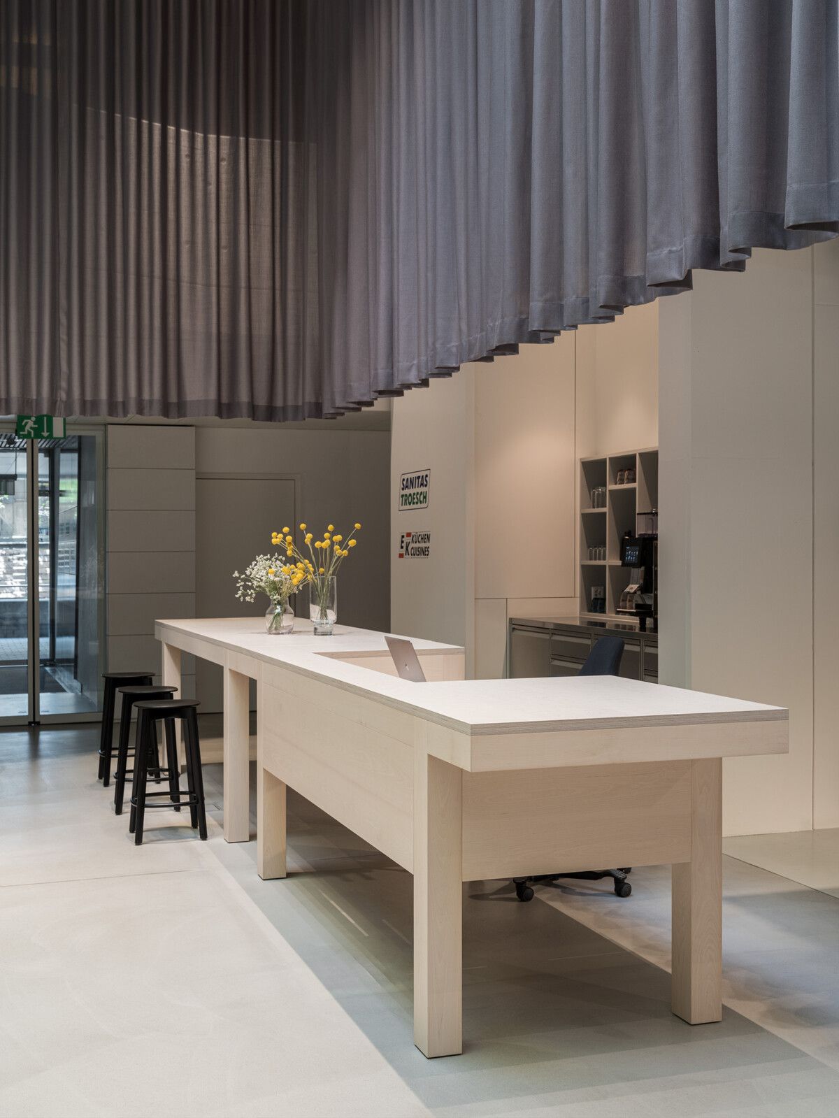 The new welcoming ritual of Sanitas Troesch is being piloted as part of the exhibition concept. Visitors are greeted with a coffee at the bar counter; directly beside it is a reception desk with an integrated workstation.